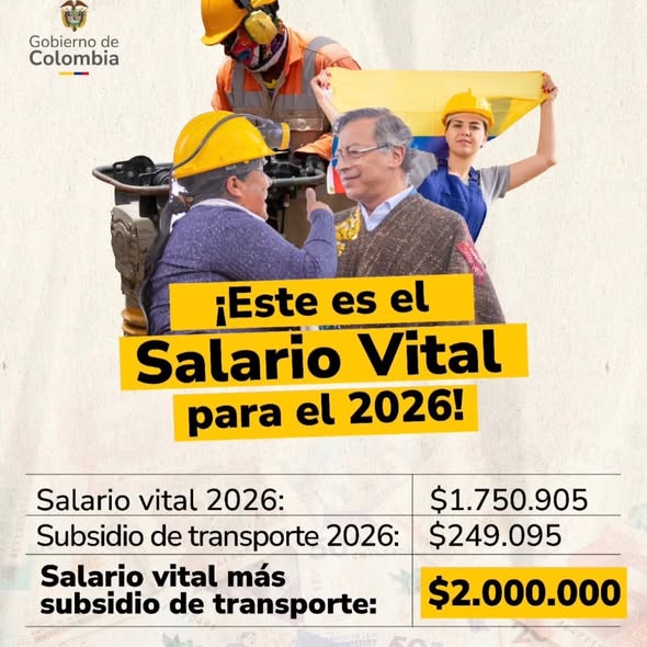 El presidente de Colombia, Gustavo Petro, decretó un aumento sin precedentes del salario mínimo para el año 2026, llevando el ingreso mensual legal a aproximadamente 1,75 millones de pesos (alrededor de 535 dólares) sin contar el auxilio de transporte, que totaliza cerca de 2 millones de pesos mensuales para más de 2,4 millones de trabajadores. El incremento, cercano al 23 % en términos nominales y 18,7 % en términos reales, supera ampliamente los porcentajes aplicados en años recientes y fue adoptado tras el fracaso de las negociaciones entre sindicatos y empresarios para consensuar un porcentaje menor.