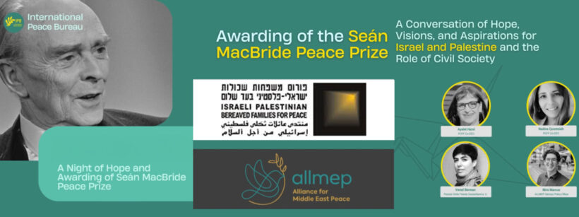 La Oficina Internacional por la Paz concede este año el Premio Seán MacBride de la Paz a dos organizaciones: el Parent Circle – Families Forum (PCFF) y la Alliance for Middle East Peace (ALLMEP). El Parent Circle es una asociación única de más de 700 familias israelíes y palestinas que han perdido a sus seres queridos en el conflicto y, sin embargo, han decidido que su dolor no debe convertirse en nuevo dolor para otros. Las dos codirectoras generales, Ayelet Harel y Nadine Quomsieh, recibieron el premio en nombre de los miembros.